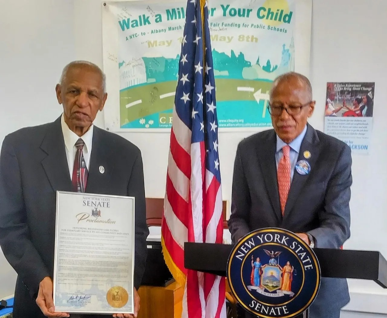 El senador por el distrito 71, Robert Jackson, de origen afroamericano, le entregó un hermoso pergamino en un acto realizado en su oficina senatorial localizada en el edificio 3056 de la avenida Broadway, en el alto Manhattan.